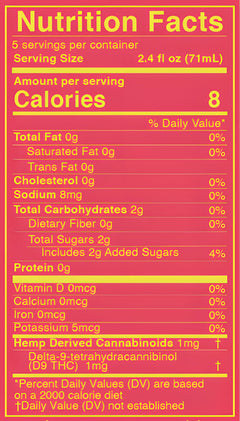 20 Calories | 5g Carbs | 5g Sugar | Contains hemp‑derived THC, vegan, gluten‑free