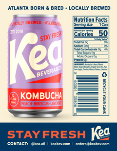 Ingredients: Kombucha Culture (Filtered Water, Organic Black Tea, Organic Green Tea, Pure Can Sugar), Peaches, Hibiscus Flowers, Lavender.