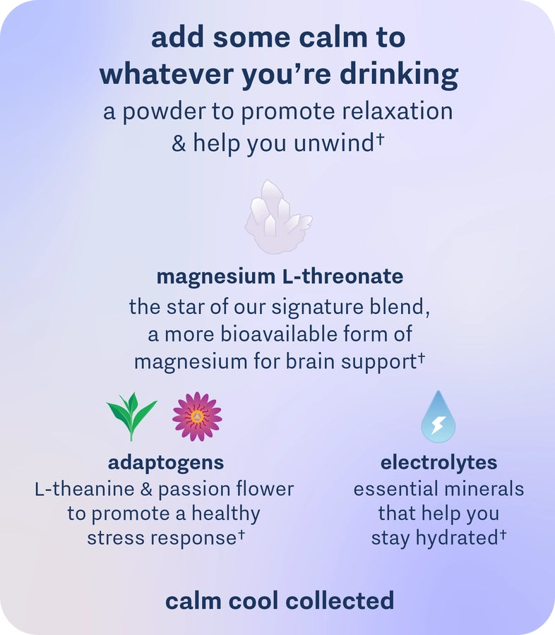 A 3-in-1 powder blend with magnesium, adaptogens & electrolytes to calm the mind & brighten the day.